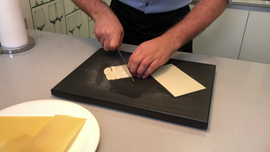 Primero, cogemos las láminas hervidas que no hemos utilizado, y con un cuchillo las cortamos en tiras.