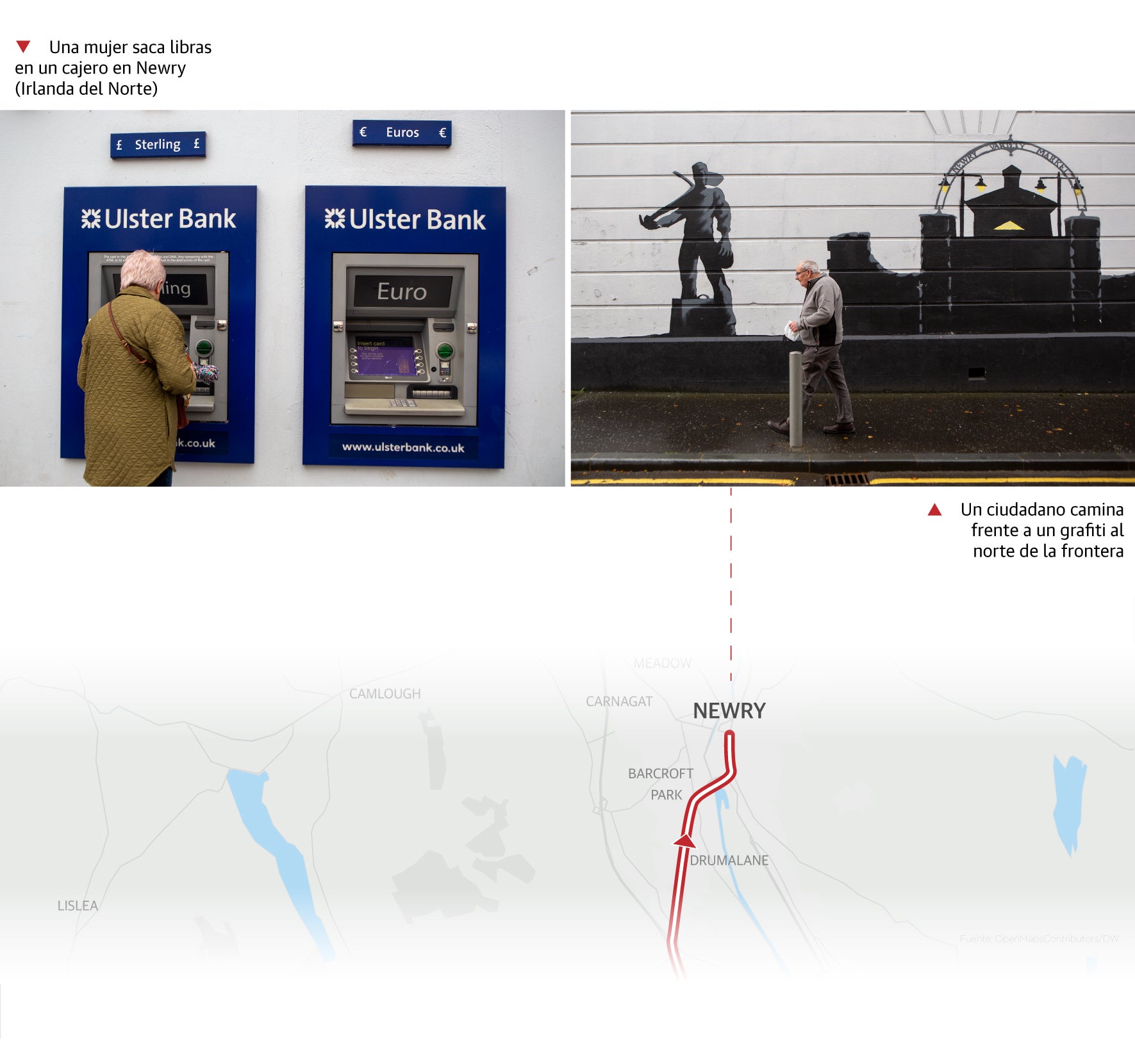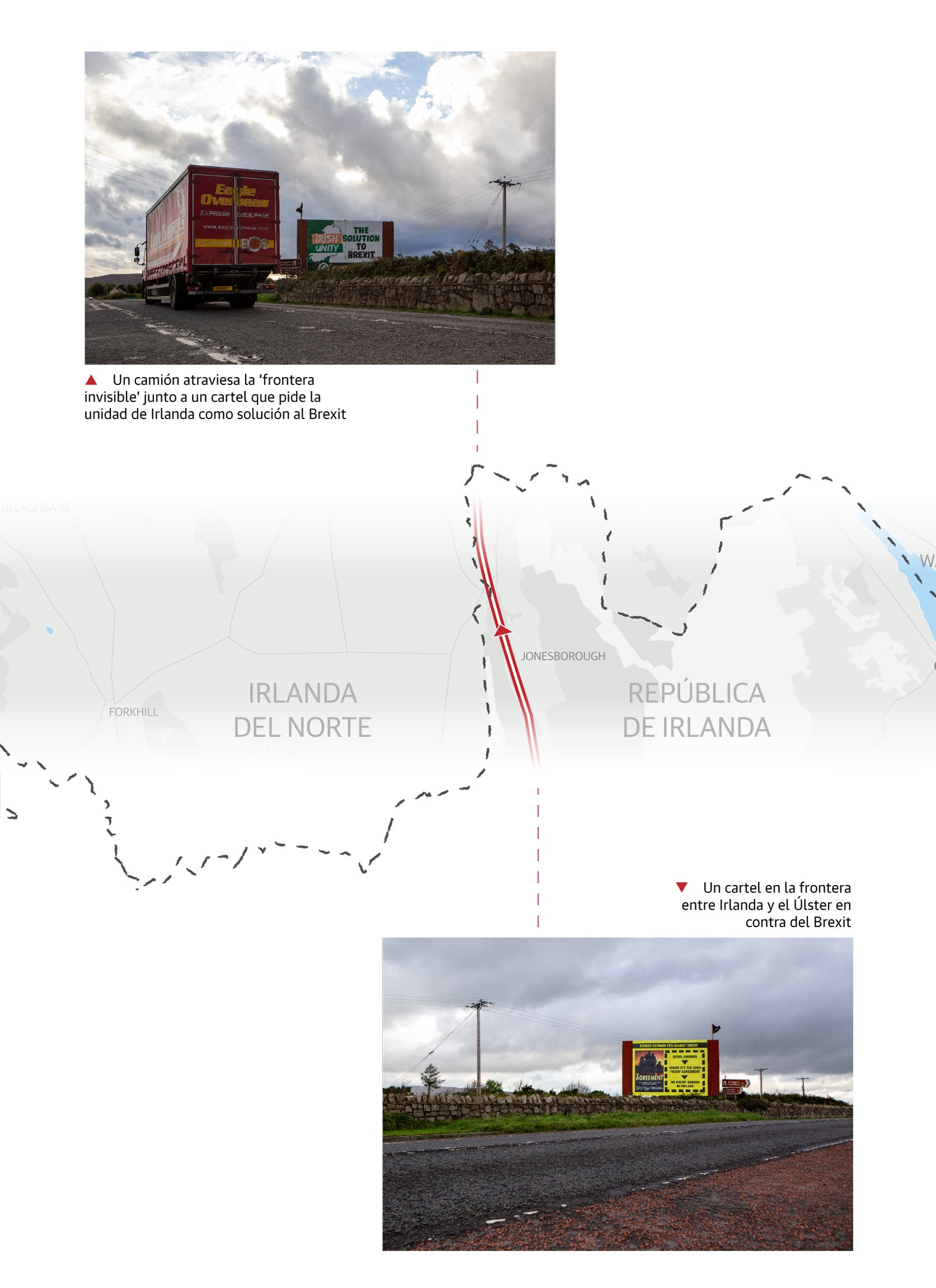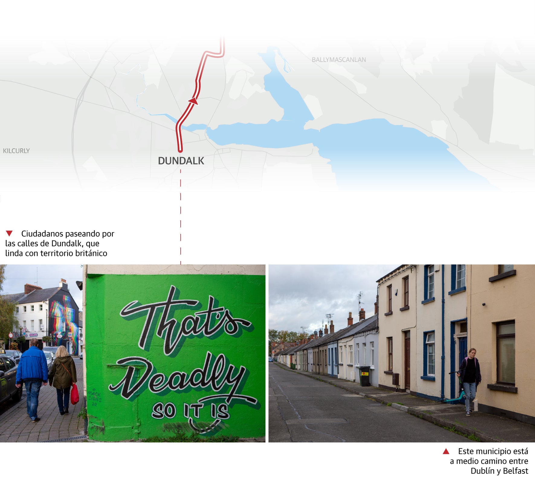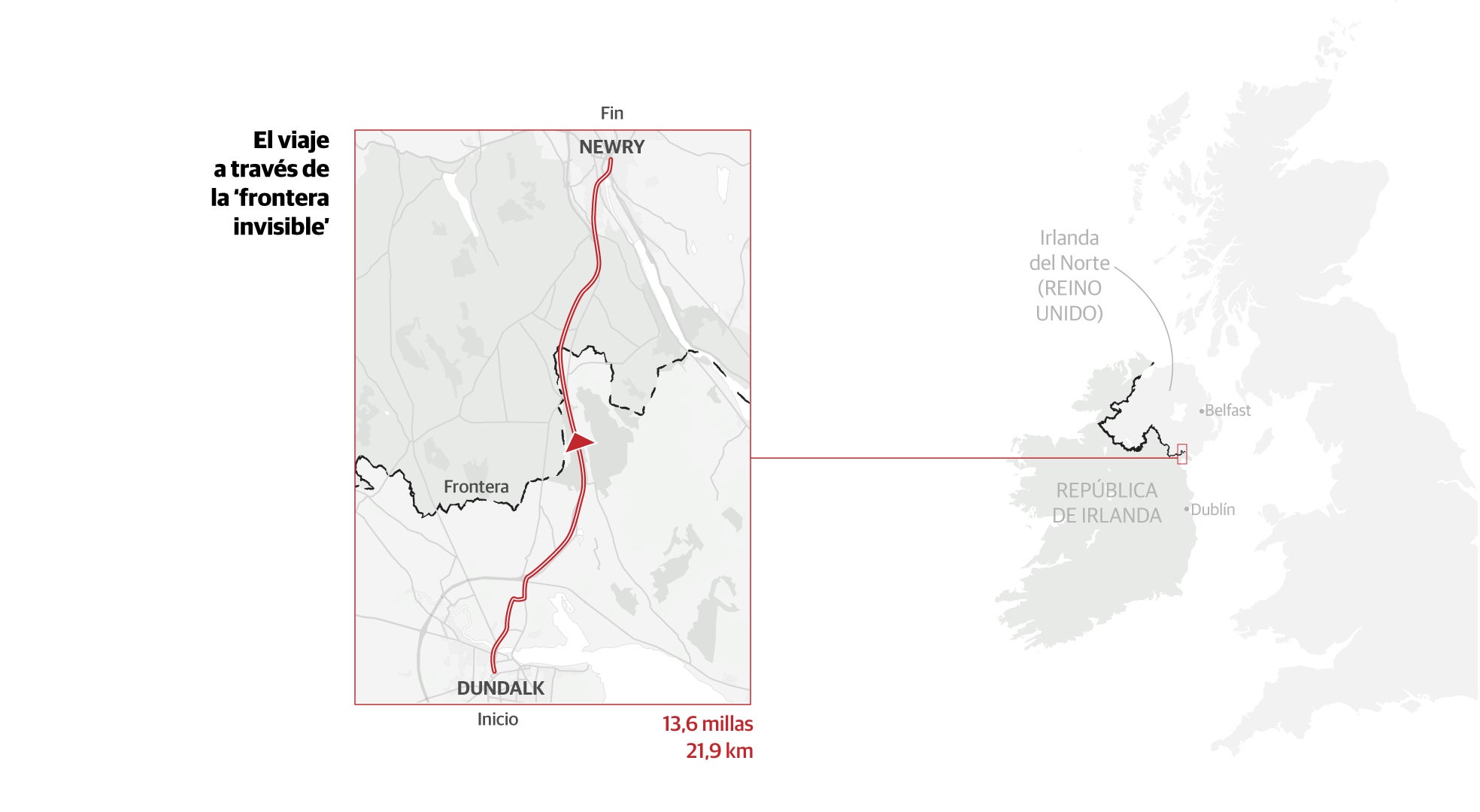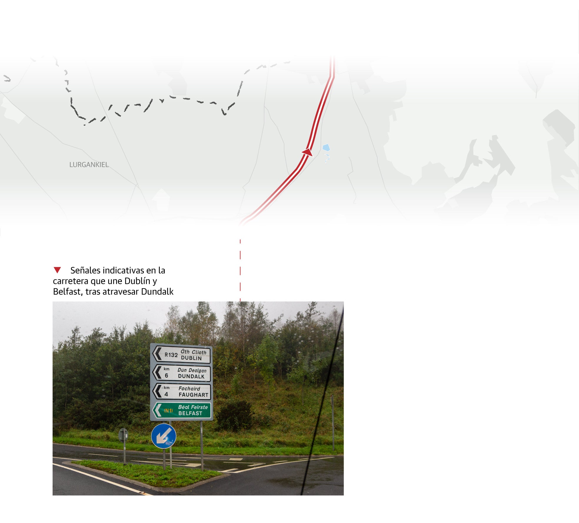 Ni controles, ni señales de 'Welcome'. Nada en la carretera que une Dundalk (República de Irlanda, mercado único) con Newry (territorio británico) indica que se ha cruzado de un país a otro. Solo el cambio de kilómetros a millas y algunos carteles en contra del Brexit o a favor de la unidad de la isla reflejan la frontera invisible por la que cada día pasan unos 35.000 ciudadanos para ir a trabajar o a hacer compras.