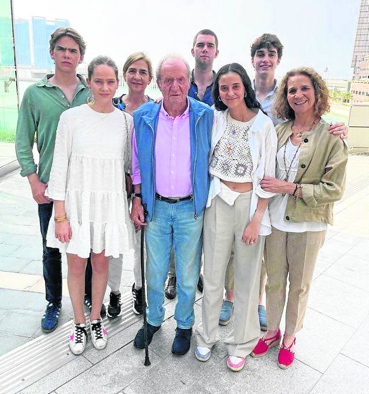 La fotografía de la discordia fue difundida el Viernes Santo a través de la agencia Europa Press para acreditar tanto la visita como el estado de salud del anterior jefe del Estado, al que se ve más delgado que en anteriores ocasiones y apoyado sobre una muleta que agarra con la mano derecha. Hasta Emiratos Árabes Unidos viajó la infanta Elena junto a su hija Victoria Federica, y la infanta Cristina con sus cuatro vástagos: Juan, Pablo, Miguel e Irene. El principal ausente en la imagen es Froilán, que siempre ha tenido una relación muy estrecha con su abuelo por parte materna.