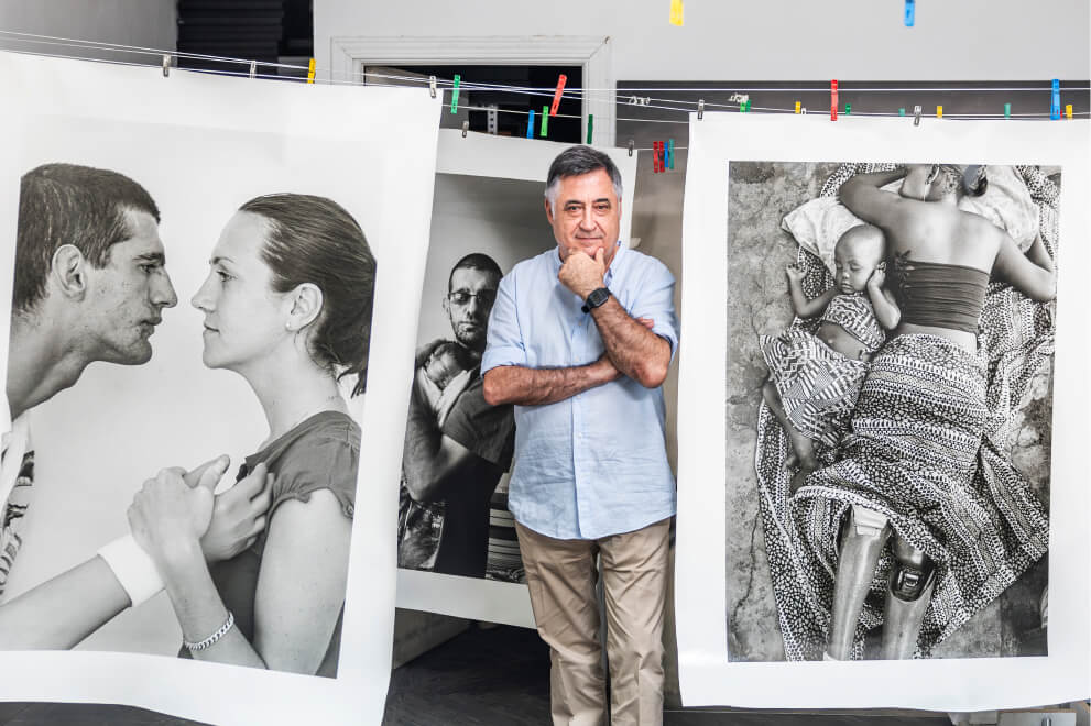 Para llevar más de media vida detrás de la cámara, Gervasio Sánchez (Córdoba, 1959) no se desenvuelve mal delante de ella. Está tranquilo, recurre a sus propios trucos como fotógrafo para ponérselo fácil al compañero de EL PAÍS: las dos piernas firmes y sin cruzar; el cuerpo, ligeramente ladeado; mentón alto... “¿Camisa, por dentro o por fuera?”, bromea Sánchez, colaborador habitual del diario Heraldo de Aragón desde hace décadas. Posa, orgulloso, delante de tres de las imágenes que componen su trabajo Vidas minadas, 25 años, un proyecto fotoperiodístico que inició en 1995 y que verá la luz el próximo 28 de septiembre en la sala de exposiciones La Lonja, en Zaragoza. También en formato libro recorrerá varias ciudades españolas en su presentación.